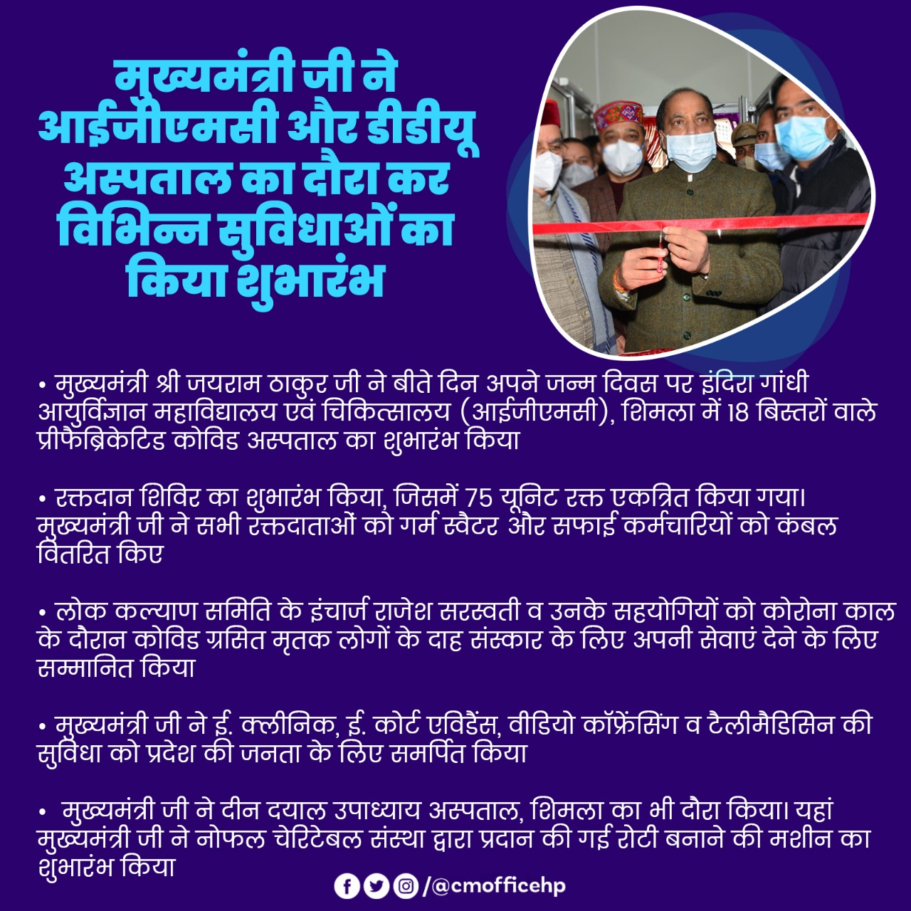 मुख्यमंत्री श्री जयराम ठाकुर जी ने ई. क्लीनिक, ई. कोर्ट एविडैंस, वीडियो काॅफ्रेंसिंग व टैलीमैडिसिन की सुविधा को प्रदेश की जनता के लिए समर्पित किया। इस अवसर पर किसान मोर्चा शिमला द्वारा भी रक्तदान शिविर में हिस्सा लिया गया और मुख्यमंत्री जी द्वारा सफाई कर्मचारियों को कंबल वितरित किए गए। लोक कल्याण समिति और समस्त कर्मचारियों द्वारा वहां उपस्थित सभी लोगों व उनके तीमारदारों को खिचड़ी व हलवा वितरित किया गया।