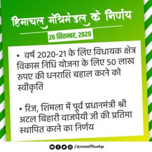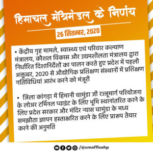 मंत्रिमंडल ने केंद्रीय गृह मामले, स्वास्थ्य एवं परिवार कल्याण मंत्रालय, कौशल विकास और उद्यमशीलता मंत्रालय द्वारा निर्धारित दिशानिर्देशों की सख्ती से पालना करते हुए प्रदेश में पहली अक्तूबर, 2020 से औद्योगिक प्रशिक्षण संस्थानों में प्रशिक्षण गतिविधियां आरंभ करने को मंजूरी प्रदान की। मंत्रिमंडल ने जिला कांगड़ा में हिमानी चामुंडा जी रज्जूमार्ग परियोजना के लोअर टर्मिनल प्वाइंट के लिए भूमि स्थानांतरित करने के लिए प्रदेश सरकार और मंदिर न्यास चामुंडा के मध्य समझौता ज्ञापन हस्ताक्षरित करने के लिए प्रारूप तैयार करने को अपनी अनुमति दी।