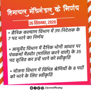 मंत्रिमंडल बैठक में सैनिक कल्याण विभाग में अनुबंध आधार पर उपनिदेशक के सात पद भरने का निर्णय लिया गया। लोगों को बेहतर आयुर्वेदिक चिकित्सा सेवाएं प्रदान करने के उद्देश्य से आयुर्वेद विभाग में दैनिक भोगी आधार पर पंचकर्मा मैस्योर (मालिश करने वाले) के 35 पद सृजित कर इन्हें भरने को स्वीकृति प्रदान की गई है। योजना विभाग में सीधी भर्ती के माध्यम से विभिन्न श्रेणियों के 8 पदों को भरने के लिए स्वीकृति प्रदान की गई।