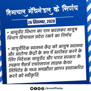 मंत्रिमंडल बैठक में आयुर्वेद विभाग का नाम बदलकर आयुष विभाग हिमाचल प्रदेश रखने का निर्णय लिया गया। मंत्रिमंडल ने आयुर्वेदिक स्वास्थ्य केंद्र को आयुष स्वास्थ्य और आरोग्य केंद्रों के रूप में स्तरोन्नत करने के लिए निदेशक आयुर्वेद और भारत सरकार के उपक्रम मैसर्ज एचएलएल लाइफ केयर लिमिटेड के मध्य समझौता ज्ञापन हस्ताक्षरित करने को स्वीकृति प्रदान की।